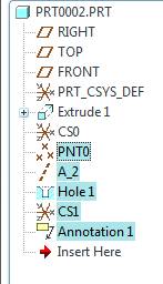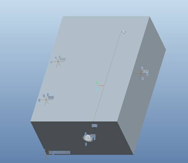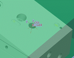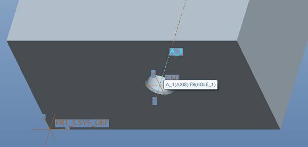 Next, I created a coordinate system on the start surface for drilling the hole. I then created a point, referencing the csys, followed by an axis. The point is used for creating the axis, and the axis will be used when we create the hole. You could probably just use the Z axis of the csys to create the axis now in WF5, but we do need some supporting geometry to get things rolling.