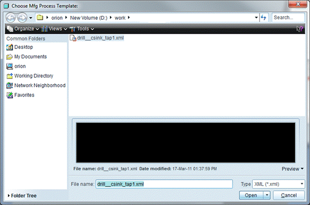 We want the Manufacturing template option. Pick, and then select OK. Next, we’ll navigate to the location new stored the xml template. Select it, and then select Open.