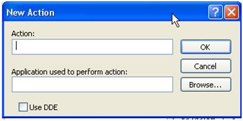 Enter the information your application. The Action: option is the description that will appear in your menu when you right click on the folder. The second option, Application used to perform action: is the executable, or batch file you want to run. Note that its generally better to browse to the location where the program is located, than to type in the path.