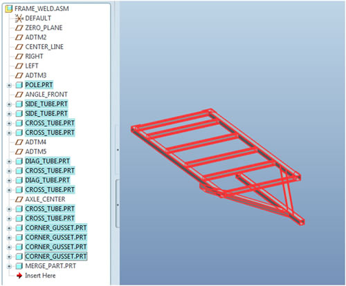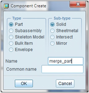 Merge models are useful for some simulation models. The process is performed in an assembly. An empty part is created in the assembly, and geometry from one or more components are copied, or merged into the empty part. The net result is that the merge part contains the geometry from the referenced model, but has one the merge feature in its model tree.