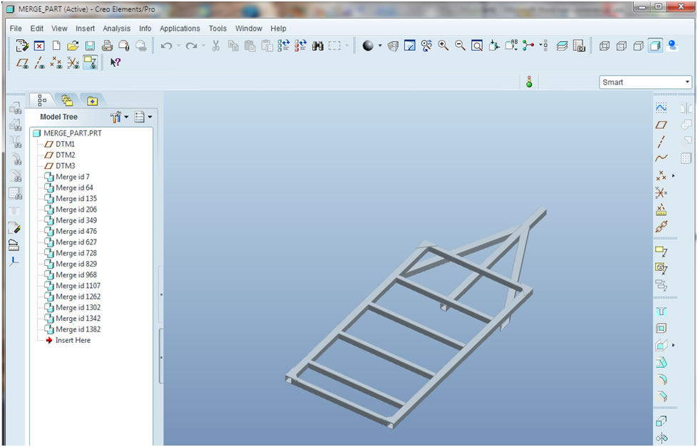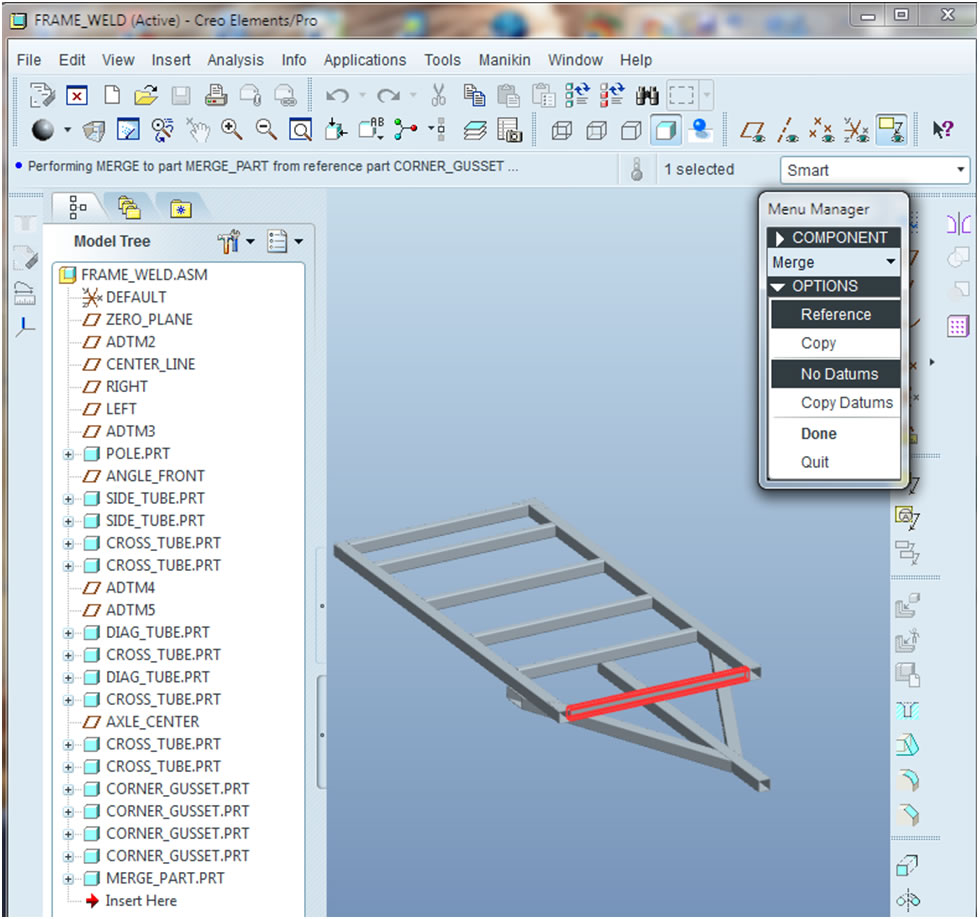 Select the Merge_part model > Ok. Next, Creo will prompt for the reference parts(s). Select the desired parts from the graphics window, or the model tree. Select Ok when finished.